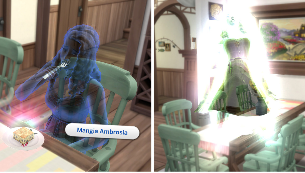 Gli ingredienti, che dovranno essere messi nell’inventario del Sim, permetteranno di preparare il piatto divino, cucinabile cliccando sul frigo → Prepara un pasto da gourmet… e selezionando l’Ambrosia. Quest’ultima dovrà essere mangiata dal fantasma il quale otterrà indietro il suo corpo e tornerà finalmente in vita.
