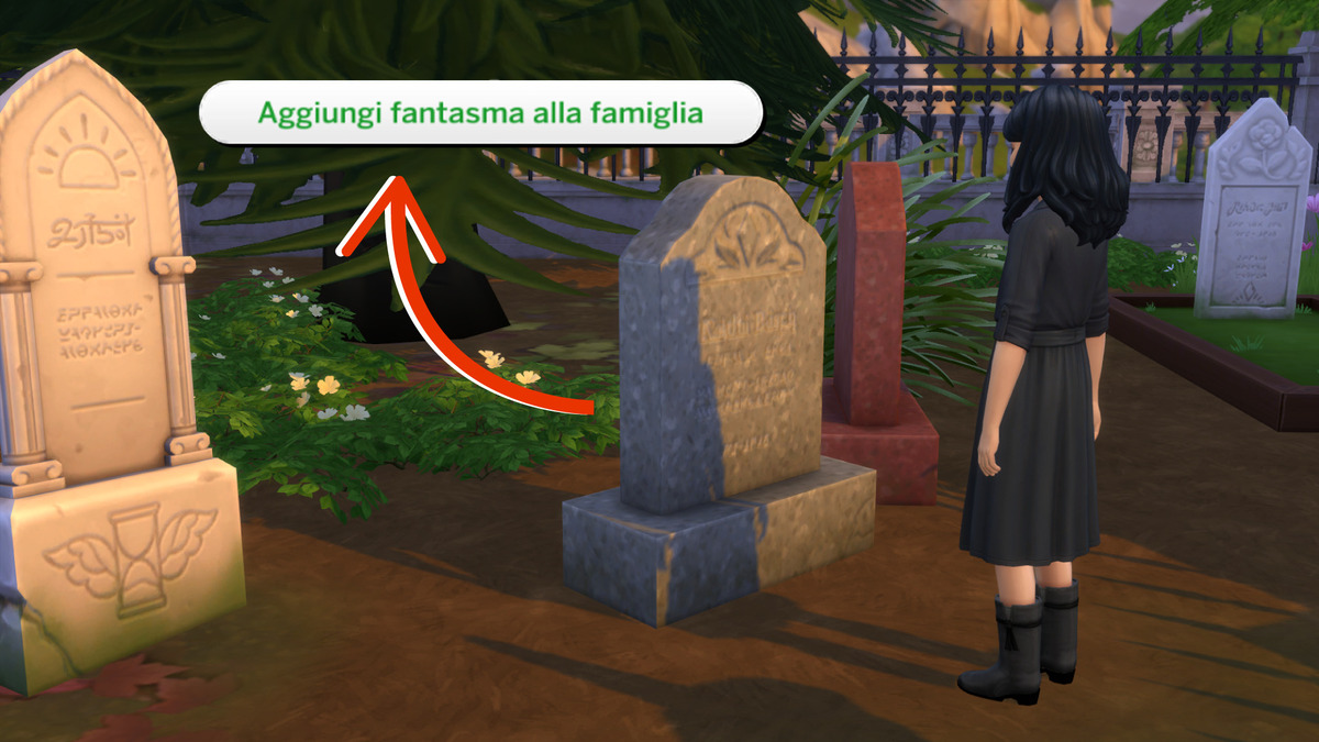 Sarà semplicissimo far unire il fantasma all’unità familiare una volta che avremo rinvenuto la sua lapide. È sufficiente cliccare su di essa e selezionare l’interazione Aggiungi il fantasma alla famiglia. Così facendo, lo spirito entrerà a far parte dell’unità familiare attiva all’istante.
