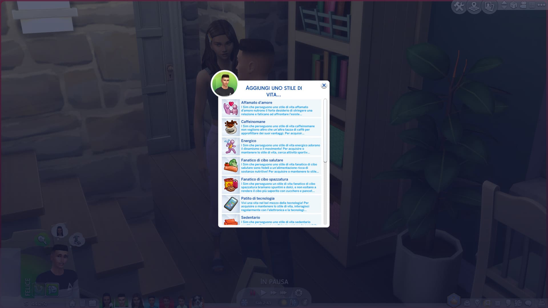 A questo punto apparirà una finestra di dialogo che ci permetterà di scegliere quale stile di vita vogliamo introdurre o togliere dagli attributi del Sim. Nel caso in cui il Sim fosse già in possesso di un determinato stile di vita, non sarete in grado di aggiungere il suo opposto.