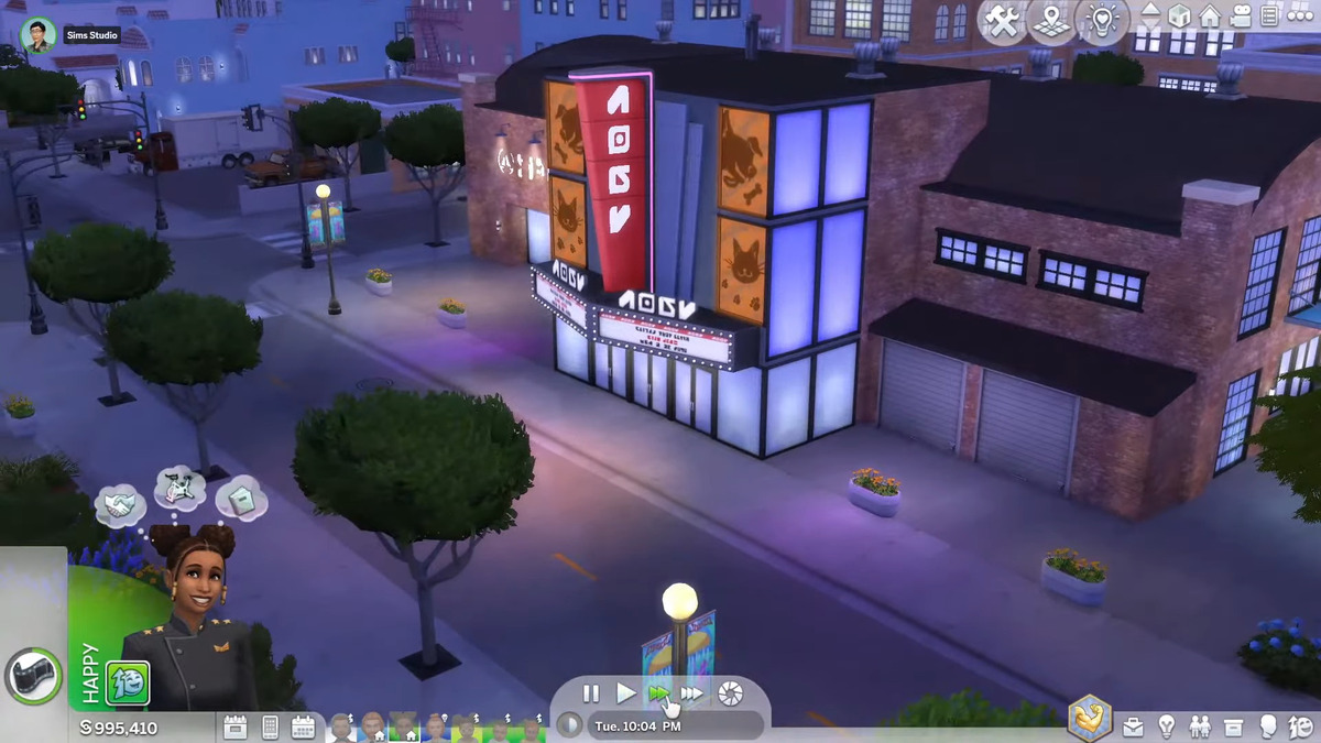 - Al di là della strada si erge un piccolo cinema/teatro. Sebbene non sia interamente accessibile (rabbit hole), abbiamo l’opportunità di cliccarvi sopra per ordinare al Sim di guardare un film (da solo o in compagnia), a scelta fra una manciata di generi disponibili.