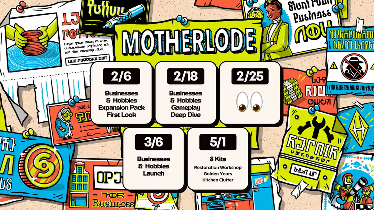La breve clip di accompagnamento all’annuncio svela in ordine le date chiave della cosiddetta “Stagione del motherlode” di The Sims 4, che partirà domani e si concluderà i primi di maggio. Sullo sfondo, una bacheca di sughero con affissi dei foglietti che costituiscono degli indizi circa i contenuti dei pacchetti che riceveremo proprio in questo periodo. Il programma è così articolato:
