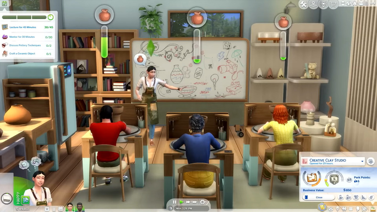 Dopo un’apertura sulla nuova abilità di ceramica – della quale abbiamo potuto osservare l’iter realizzativo – il trailer di gameplay di The Sims 4 Hobby & Attività si sposta sulla configurazione delle nuove attività commerciali, identificate dal gioco con l’espressione Piccole Attività. Qui notiamo come un pannello gestionale consenta innanzitutto di attribuire un nome, una descrizione ed un’icona al proprio esercizio. Il vivo del processo arriva a questo punto: si possono designare fino a cinque attività che la clientela assumerà come comportamenti, fra quella che si profila essere una vastissima selezione di opzioni. Per aiutare il giocatore ad orientarsi, sono stati messe a disposizione anche delle definizioni preimpostate (come Palestra o Studio di ceramica) con le relative attività da personalizzare a piacimento.
