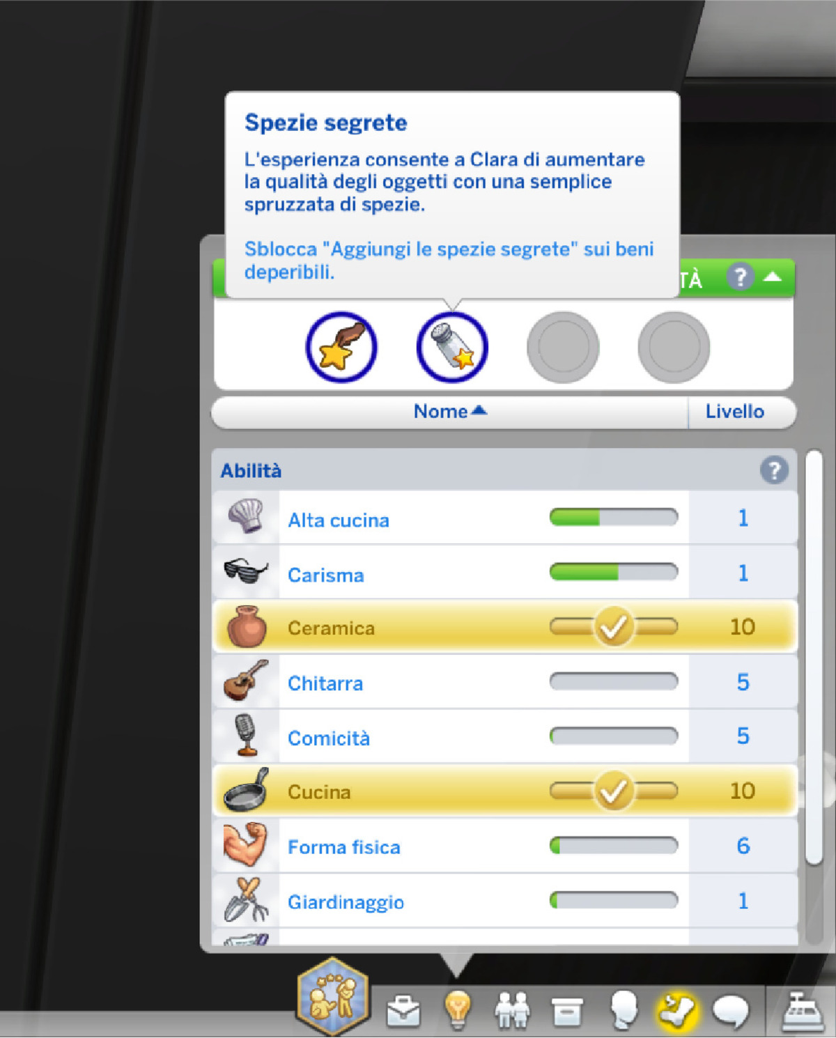 Quando un personaggio entra in possesso di una maestria, sarà possibile tenerne traccia espandendo il pannello delle abilità. Una sezione posta in alto mostra quelle conseguite dal Sim, con informazioni su ognuna di esse consultabili al passaggio del mouse.