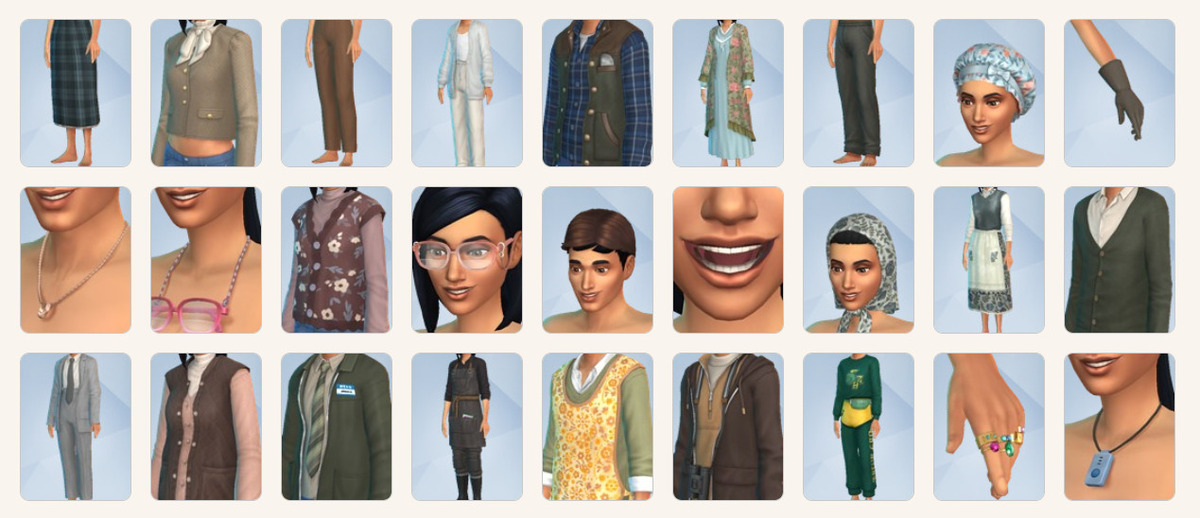 A differenza degli altri due, The Sims 4 Anni d’Oro rappresenta una raccolta di nuovi elementi per il Crea un Sim. Il guardaroba si rivolge in particolar modo alla fascia d’età di anziano, che ora vede la sua gamma di opzioni espansa con graziose aggiunte come occhiali con cordino, un parrucchino e guanti da giardinaggio. Gli abiti e gli accessori qui presenti si coniugano a più categorie di abiti, dai quotidiani a quelli sportivi.