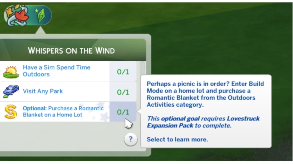 Alcuni di questi obiettivi compariranno solo se il giocatore è in possesso di specifici Expansion Pack, rispettivamente: Cani & Gatti, Oasi Innevata, Vita nel Ranch e Colpo di Fulmine. Non temete però: benché soddisfarli accumuli più velocemente punti, la loro presenza non è affatto obbligatoria ai fini del completamento dell’intero evento.