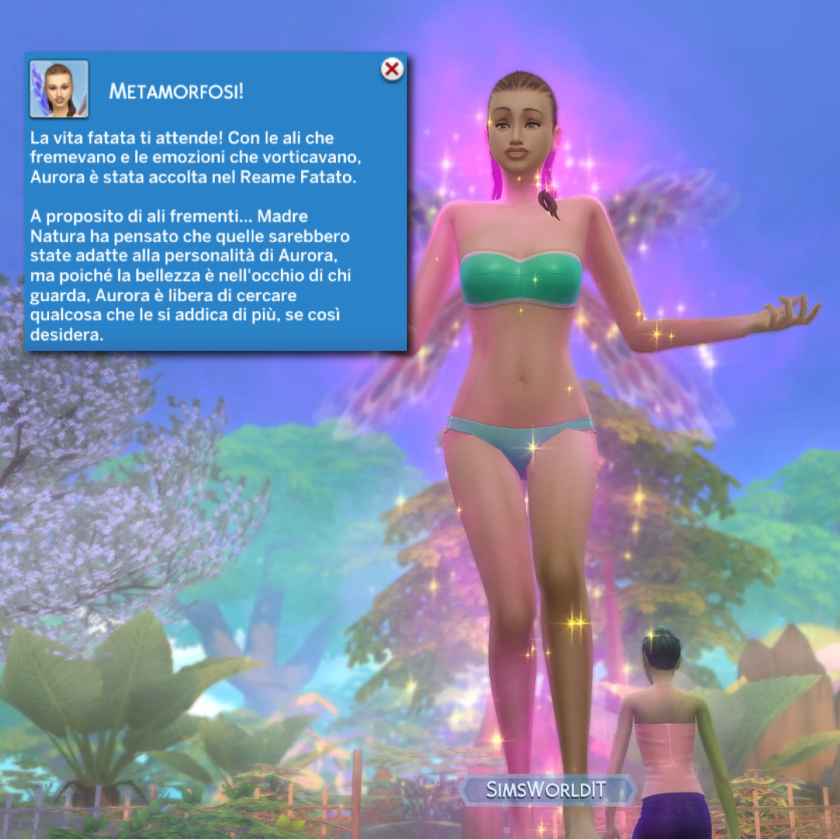 Ora che l’abbiamo individuato, occorre solo cliccarci sopra e selezionare “Diventa una fata“. Non ci resta quindi che assistere meravigliati alla trasformazione del Sim che, entrato nel lago, riceve le sue ali e diventa solennemente una fata! Le forma delle ali assegnatagli è totalmente casuale, ma questo non significa che non si possa cambiarla. È infatti possibile personalizzare l’aspetto della nostra creatura fatata in qualsiasi momento cercando uno specchio e cliccando su “Modifica il Sim”.