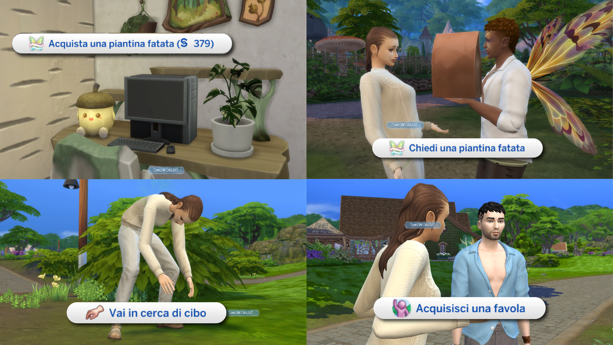- Andando in cerca di cibo. Con il Sim in possesso di almeno livello 2 dell’abilità di vita naturale, possiamo cliccare in un punto del terreno e scegliere Vai in cerca di… → Vai in cerca di cibo. Esiste una piccola possibilità che facendo questo si dissotterri proprio una piantina fatata. Tentare in un giorno fortunato è d’aiuto.