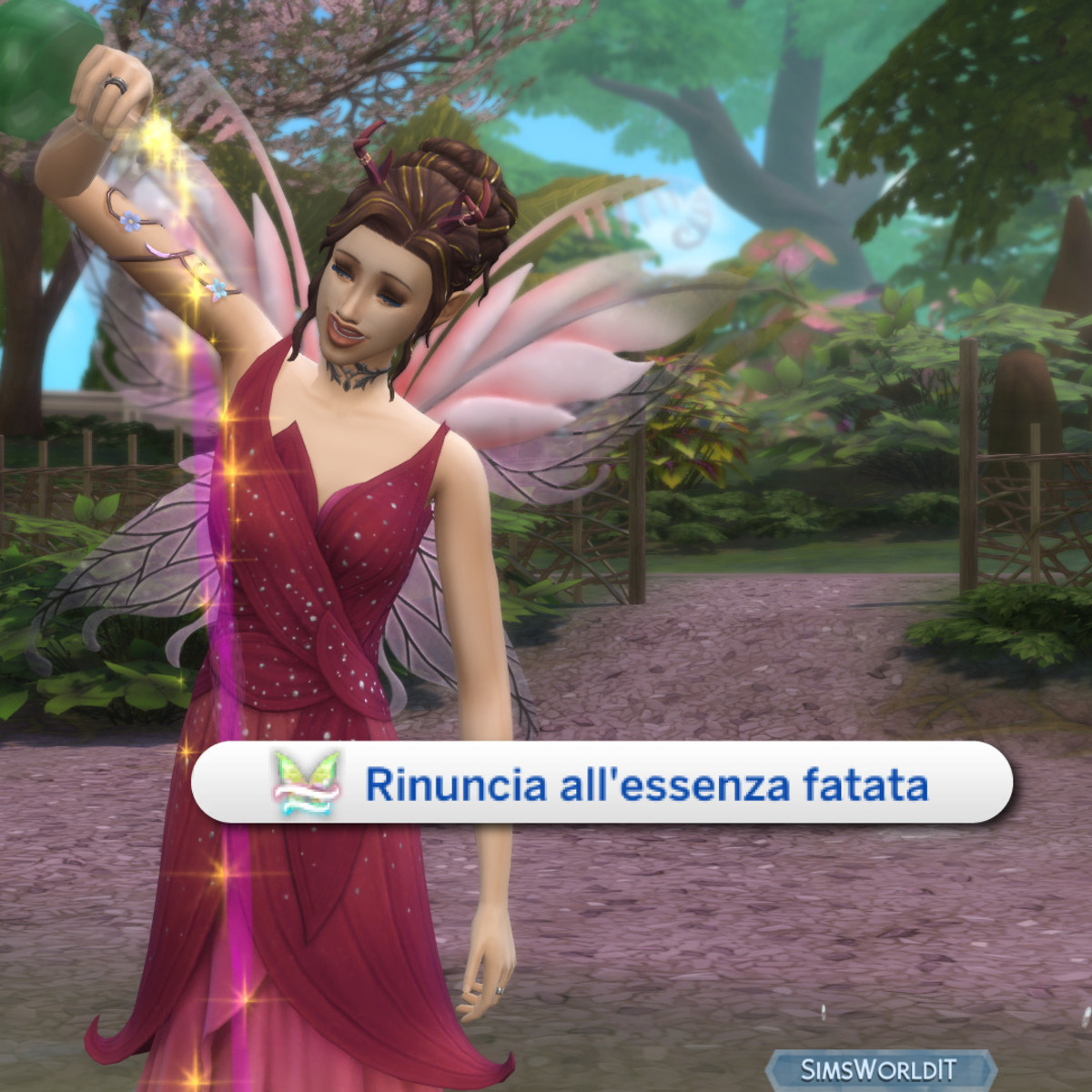 Il percorso di rinuncia di una fata è analogo e speculare a quello affrontato quando lo si diventa per la prima volta. In tal senso, dovremo procurarci un altro esemplare di piantina fatata e interrarlo per evocare nuovamente Madre Natura, alla quale chiederemo poi di “Rimuovere l’essenza fatata” tramite un’interazione sociale. Sarà lei a separare il Sim dalla sua essenza fatata, distillata in una pozione che finirà nell’inventario personale.