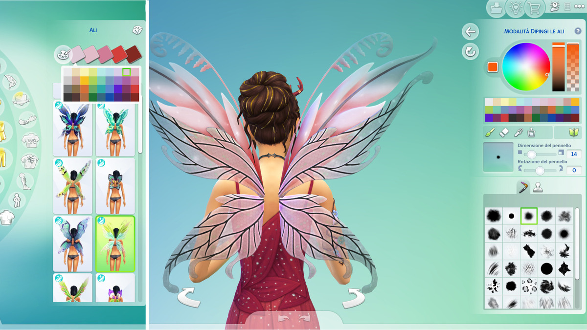 Mentre si modifica l’aspetto fatato di un Sim si ha accesso a delle opzioni di personalizzazione aggiuntive. Facendo clic sulle ali ne possiamo scegliere la struttura fra oltre 20 varianti disponibili. Ciascuna di esse vanta inoltre quattro o cinque zone di applicazione del colore distinte, impostabili interagendo con la palette posta nella parte superiore della colonna. Coloro che vogliono entrare scendere ancora più nel dettaglio possono entrare in Modalità Dipingi e colorare l’area liberamente; potendo contare su pennelli, stampe, gomma ed una selezione illimitata di tonalità grazie alla ruota dei colori.