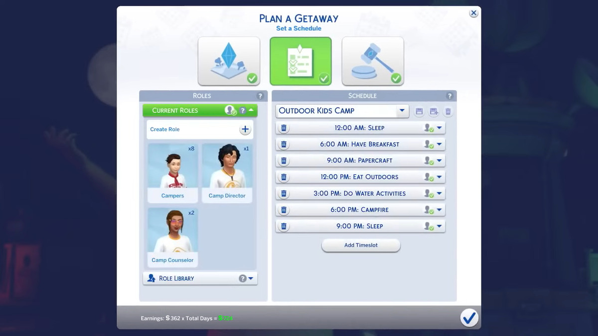 Ogni gita prevede la propria scaletta, che definisce quali attività si devono svolgere e in quali orari, con l’aggiunta di regole o sfide opzionali: è qui che si indicono le gare ad eliminazione a mo’ di reality show. Le gite possono durare per più giorni ed anche ripetersi settimanalmente, facoltà che rende possibile pianificare delle routine periodiche per i nostri Sims che vadano oltre il concetto di vacanza.