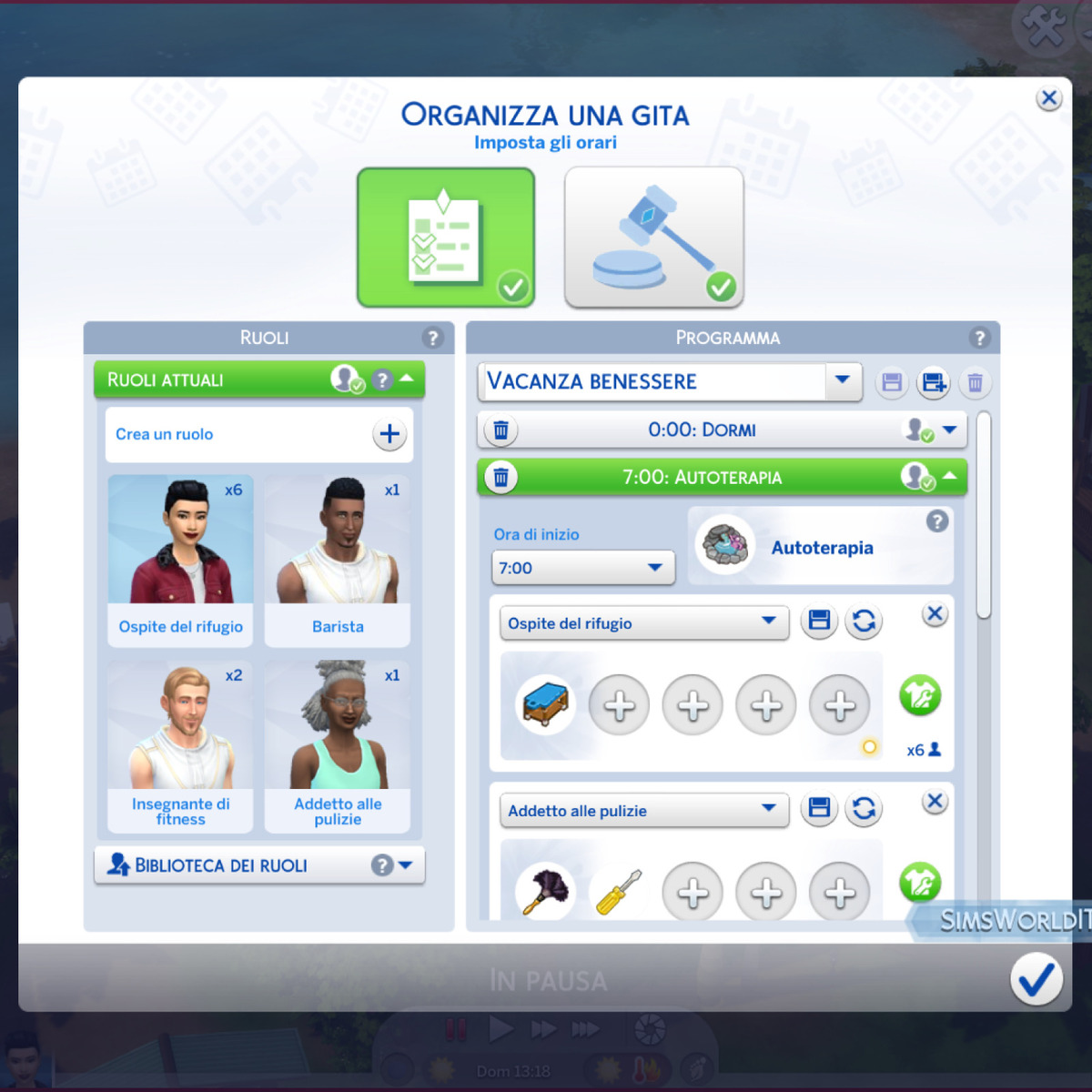 Un esempio d’uso di questo sistema all’apparenza complicato può aiutare a far chiarezza. Immaginate una gita con destinazione un centro benessere: dopo aver definito i ruoli di ospite, addetto alle pulizie, barista e istruttore ginnico, creiamo una fascia oraria dedicata al relax. Impostiamo “Autoterapia” come attività principale, quindi istruiamo i vari ruoli a seguire i certi comportamenti: