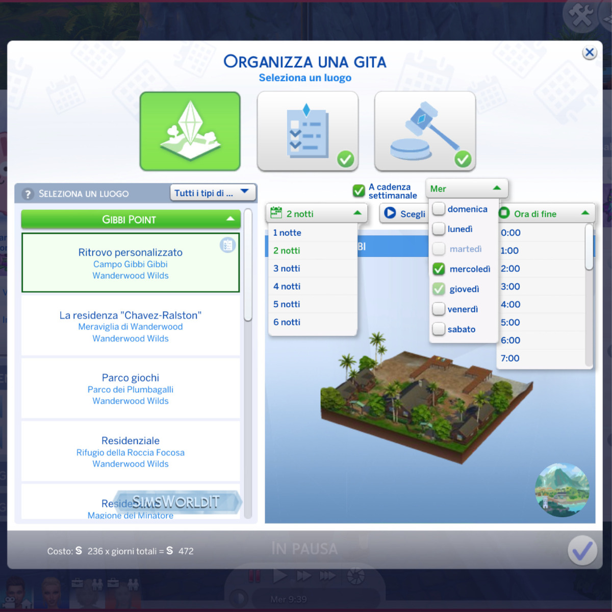La prima delle tre sezioni della finestra definisce il luogo e le tempistiche della gita. Dal menu di sinistra selezioniamo quindi la nostra destinazione, avendo di fronte a noi l’imbarazzo della scelta: si può soggiornare nella maggioranza dei lotti, che siano residenziali, comunitari o i nuovi ritrovi personalizzati. Qualunque sia la nostra scelta, assicuriamoci che sia fornita di letti a sufficienza e degli oggetti previsti dalle attività che intendiamo praticare.