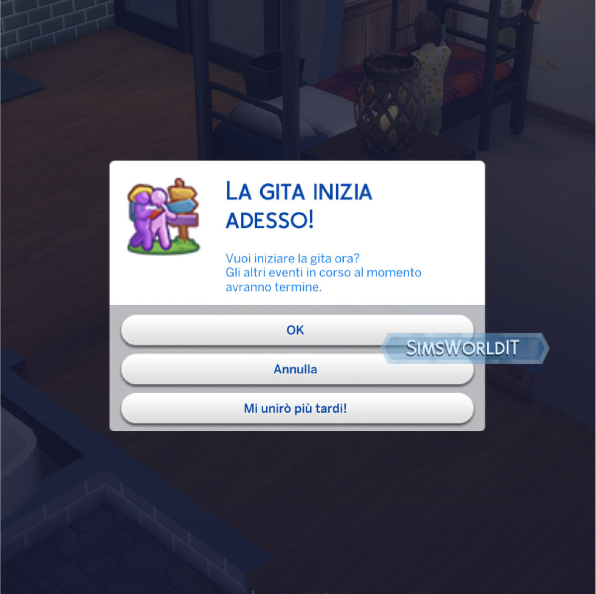 Se abbiamo finito di preparare il nostro itinerario, non ci resta che premere sul pulsante di conferma per ufficializzarlo. Nel caso in cui non tutta la famiglia prenda parte alla gita, una schermata ci chiederà se intendiamo seguire i viaggiatori o se restare a casa con gli altri, quando arriverà l’ora di partire. Questa possibilità che può fungere da espediente per allontanare dei Sims per qualche giorno, ad esempio spendendo i bambini a un campo estivo.