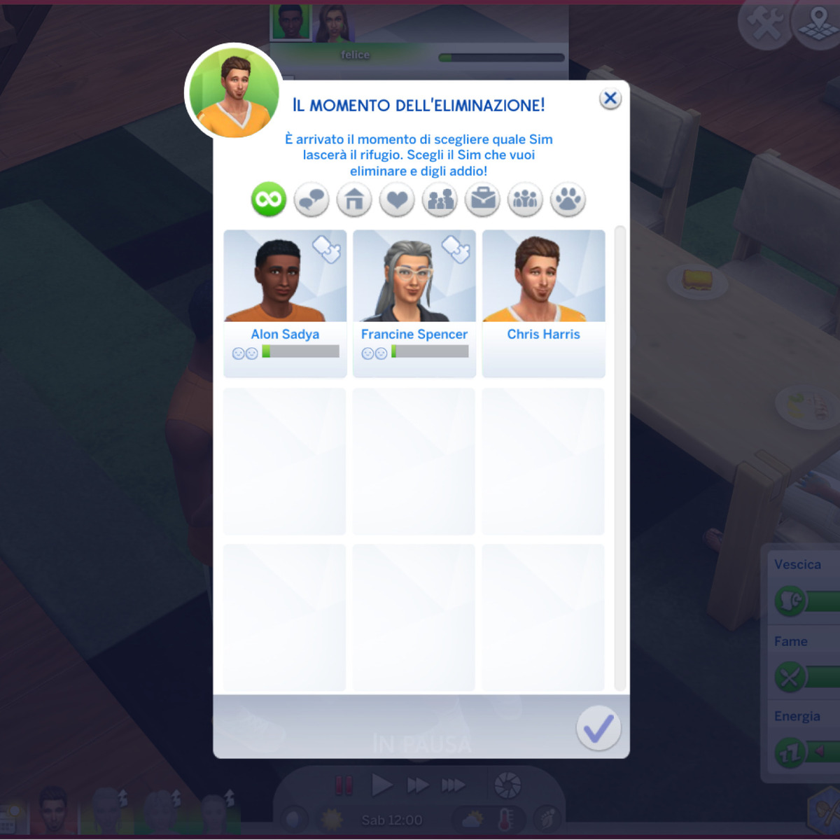 Ciascuna gara si basa sullo sviluppo di un certo tipo di relazione o abilità (o gruppo di abilità), il quale può seguire due logiche alternative. Sempre in questa fase decidiamo infatti se a venire eliminato debba essere il Sim che ha aumentato di meno l’abilità/relazione in questione o quello che ne possiede il punteggio più basso in senso assoluto. Ci basta cliccare sul rettangolino preposto per passare dall’uno all’altro meccanismo.