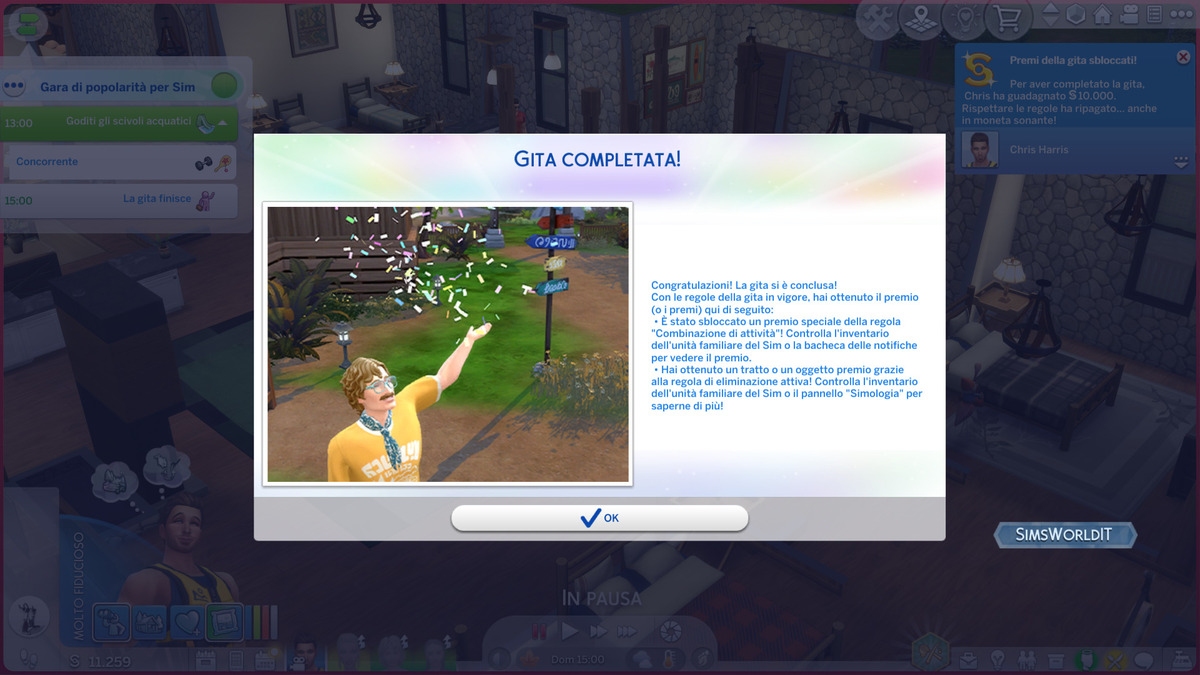 I premi assegnati al vincitore sono pressoché casuali, dato che non c’è modo di decidere cosa mettere in palio. Sappiamo per certo che possono consistere in tratti bonus o oggetti della Modalità Costruisci, ma per scoprire ciò che abbiamo ricevuto nello specifico dovremo controllare rispettivamente il pannello “Simologia” o l’inventario dell’unità familiare. Diversamente, i soldi vengono talvolta attribuiti solo se sono state applicate determinate regole (come Combinazione di attività, che può fruttare ben 10.000 simoleon).