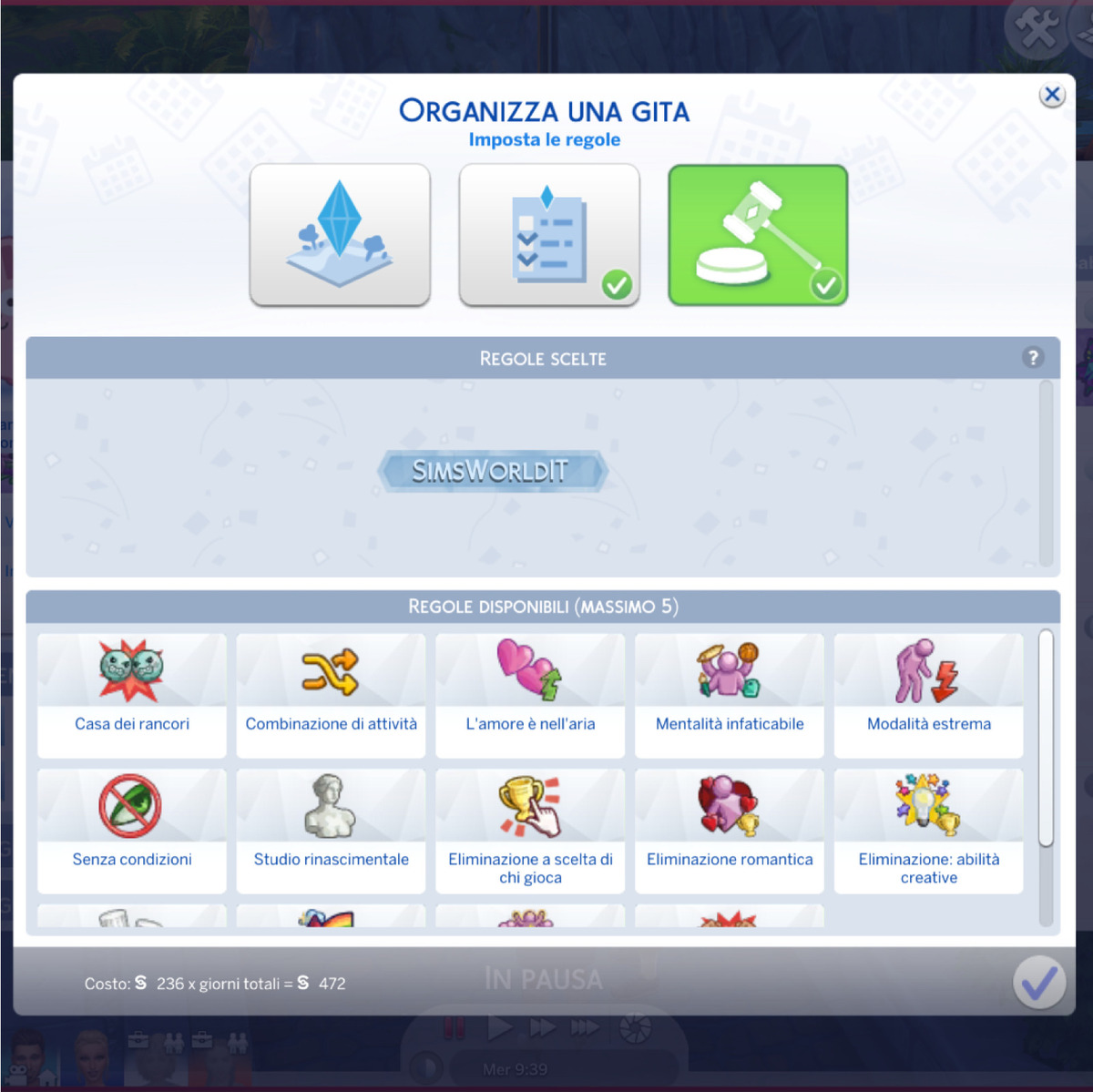 Come ogni altra gita, anche quelle che ospitano delle competizioni devono necessariamente prevedere un lotto di destinazione, una durata, i ruoli dei Sims che vi partecipano e un programma orario delle attività. Se non avete ancora dimestichezza con la configurazione di questi aspetti, vi rimandiamo alla nostra guida generale sulle gite proprio qui sotto! Per il resto, ci limitiamo a suggerire delle scelte che siano ottimizzate per delle competizioni: