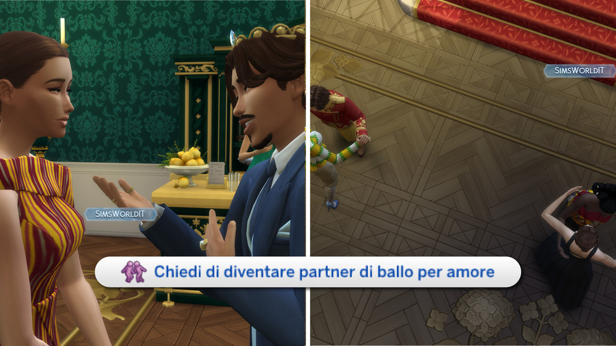 Durante un gran ballo si esegue un valzer, per cui è innanzitutto consigliato cercare e domandare ad un Sim di fare coppia andando su Partner di ballo → Chiedi di diventare partner di ballo. Le ragioni della proposta possono essere tre: per amicizia, per amore o per status sociale. Se scegliamo la seconda o la terza, ci converrà rendere il nostro compagno rispettivamente flirtante o fiducioso per indurre la giusta atmosfera. A quel punto clicchiamo sulla pista da ballo e optiamo per “Inizia il valzer“, cosa chiamerà in posizione tutte le coppie nell’attesa di sfoggiare dei coordinati passi di danza.