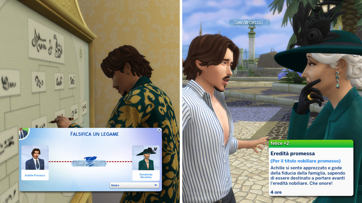 Promettere in eredità il titolo. Anticipando i tempi, il Sim nobile può rivolgersi al figlio o al coniuge e affidargli il futuro comando tramite l’interazione amichevole “Prometti di ereditare il titolo nobiliare“. A parti invertite troviamo invece “Chiedi di ereditare il titolo nobiliare“.
