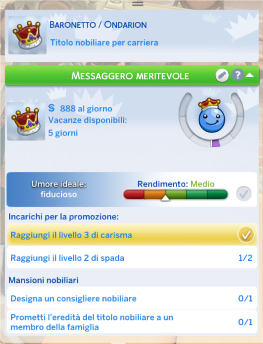 In questo modo il nuovo Sim riceverà il tratto temporaneo “Eredità nobiliare promessa”, che lo eleverà immediatamente al livello di carriera raggiunto dal nobile non appena questo si ritirerà o passerà a miglior vita. Se l’erede lascia la carriera o si trasferisce in un altro scenario, perderà il diritto al titolo.