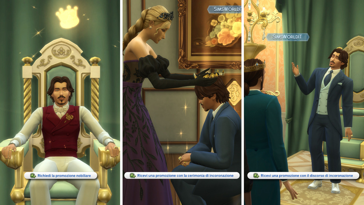 Tramite cerimonia d’incoronazione. La scelta è disponibile solo durante una seduta di corte (clicchiamo su un trono → Ricevi a corte) . In questi frangenti il Sim incoronatore si porrà di fronte al nobile e, dopo aver pronunciato un breve discorso, porgerà sul suo capo la corona che suggellerà il suo avanzamento al nuovo rango.