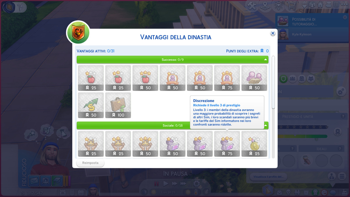 Avere alle spalle una dinastia familiare può fornire un particolare vantaggio in materia di segreti e scandali in The Sims 4. L’aumento progressivo del prestigio conferisce dei punti spendibili in vantaggi estesi a tutta la stirpe, e fra questi figura il bonus “Discrezione“. Diviso in tre livelli di potenziamento, esso fa in modo di ridurre la durata degli scandali che coinvolgono i membri, abbatte le tariffe chieste dal Sim informatore e rende più facile la scoperta di segreti.