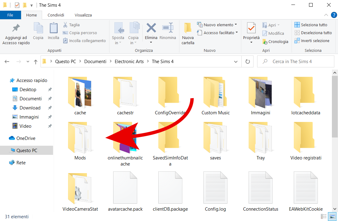 La cartella destinazione di tutto il materiale personalizzato – eccetto Sims e lotti – è localizzata in Documenti\Electronic Arts\The Sims 4 ed è nominata Mods. Se avete avviato almeno una volta il gioco, la troverete qui già presente con incluso al suo interno un file denominato Resource.cfg. Quest’ultimo non deve essere spostato, in quanto strettamente necessario per la lettura dei contenuti personalizzati.