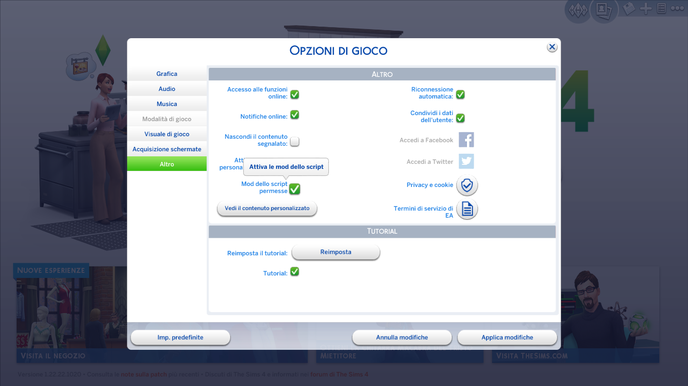 Per far comparire i CC nel gioco non basta solo inserirli nella cartella Mods, ma è anche necessario abilitarli. A questo scopo, è sufficiente aprire il gioco, andare nelle opzioni di gioco, cliccare sulla sezione “Altro“, mettere la spunta a “Attiva il contenuto personalizzato e le mod“, quindi cliccare su “Applica le modifiche“.